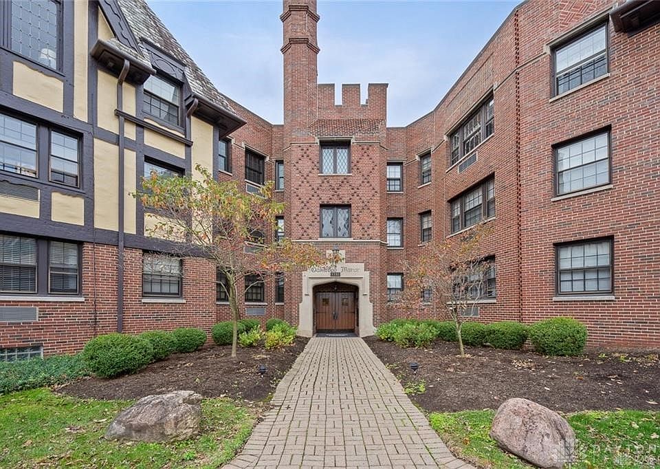2nd floor Tudor style condo at Historic Oakwood Manor, larger unit than others, elevator building,1 bedroom,1 bath, loaded with character, HOA $638/month-includes water, sewer, trash, insurance, heat, indoor garage spaces available based on availability, custom carpet & tile, custom drapes, updated appliances, large rooms, private storage room on top floor, coin laundry in low level, enjoy condo lifestyle with low maintenance, great location to shopping, dining, library, University of Dayton-Oakwood school district!. Rely on your own measurements. Agent Owned.