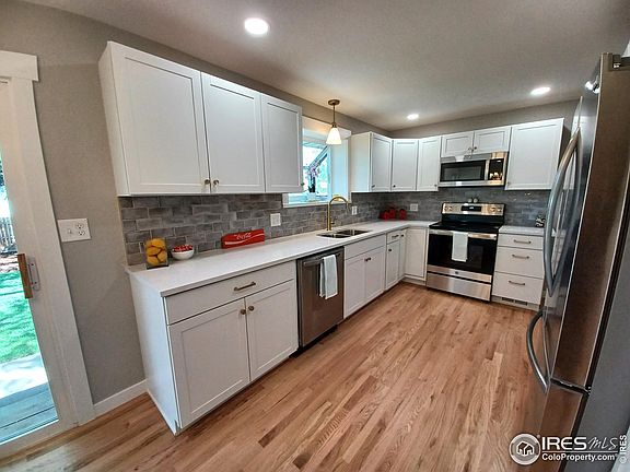 Stunning remodel near downtown Loveland! This brick ranch home features an array of updates including a new kitchen, two new baths, new roof, back yard landscaping and much more. Inside you'll find 3 bedrooms and 1 full bathroom on the main level, as well as an eat-in kitchen and living room, plus interior access to your oversized 1 car garage. The full-sized basement is finished with a bedroom, three-quarter bathroom, family room, laundry/storage room, and workshop. You'll find tons of storage space both inside and out, and the large backyard leads to extra spaces for cars, toys, and/or recreational vehicles. The neighborhood offers nearby restaurants, coffee shops, grocery stores, parks, schools, shopping, and entertainment - Lake Loveland and Downtown Loveland are also close by!