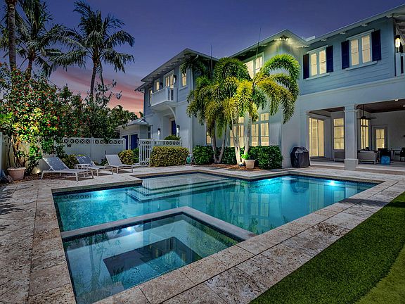 An exceptional opportunity to experience both luxury and location just in time for the Season. This Bermuda-inspired residence, set on a approximate 12,730 square foot lot, masterfully blends opulence with convenience. This 4-bedroom, 4-full bathroom, 2 half-bathroom, expansive 3-car garage provides ample space for guests, and your lifestyle. Located just one block from the Atlantic Ocean, you'll enjoy stunning sunrises and the pristine sands of Delray Beach. In a mere two-minute golf cart ride, immerse yourself in the vibrancy of Downtown Delray, where a dynamic nightlife, upscale shopping, and a wide variety of dining options await. Stroll down Atlantic Avenue, lined with charming boutiques and live music venues. When the day winds down, retreat to your peaceful residence, quietly tucked at the end of a brick-laden cul-de-sac. Whether lounging poolside or perfecting your putt on the lush green, relaxation is at your fingertips. After a day of leisure, gather around the roaring fire under the covered patio, perfect for creating lasting memories.