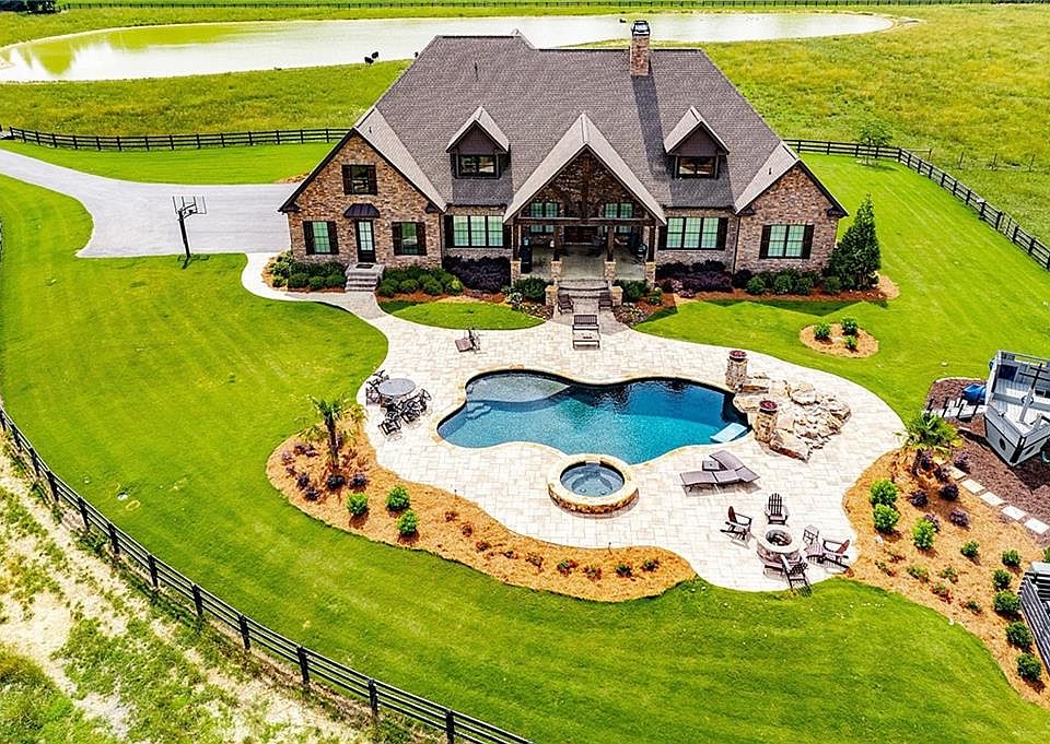 The possibilities are endless with this gorgeous 39.55 acre Gordon County farm in Northwest Georgia, with hundreds of feet of frontage on the Coosawattee River. When you drive through the secure, gated entrance, you'll see the beautiful home built in 2019 atop a pretty knoll overlooking the two acre stocked lake. The views from the back beckon you across the pastures and down to the river. Upon entering the home, you'll immediately notice the fine, quality workmanship and attention to detail. Much of the main level is floored with distressed European white pine flooring. The massive floor to ceiling stone fireplace in the great room draws your eyes up to the 14 foot coffered ceilings covered in tongue and groove pine. The same wood extends out to the high, vaulted ceiling on the covered porch, which overlooks the custom saltwater, gunite pool with waterfalls, fire bowls, a hot tub and a fire pit. Back inside, you'll find a huge walk-in pantry next to the large, custom kitchen and breakfast area, a half bath with a door leading to the pool, a safe (storm) room with two doors and reinforced steel, a separate dining room, an office and craft room and three bedrooms. The two secondary, oversized bedrooms share a Jack and Jill bath and each has its own large walk in closet. The owners' suite overlooks the pool and pastures and opens to the back porch. The en suite bath features a cast iron tub, a stone and tile shower with dual shower heads and cabinets constructed from reclaimed barn wood. The bath is adjacent to the huge walk in closet, which opens up to the nice sized laundry room. Upstairs you'll find an enormous bonus room / bedroom, a bath, a large fifth bedroom, an office / workout room and a home theater with massaging recliners for those movie nights at home. You'll also find loads of attic storage on this level. Outside, just inside the front gate is a 4,000 square foot shop with sliding and roll up doors, perfect for your equipment or RV and on top of that, there's a one bedroom, one bath apartment that would be perfect for a farm caretaker or extended family members. Driving to the back of the property, you'll notice the thousands of feet of wood fencing. The property is fenced and cross fenced with several different sections for livestock. There are also four automatic, freeze proof waterers for animals and several shelters for animals spaced throughout the pastures. Horse stalls could easily be added to the large barn next to the river. And where else will you find a 100 yard football field with a walking track? It's here on the property, just waiting for a game to start! There's easy access to the river from a ramp leading down to it. Bring the boats!