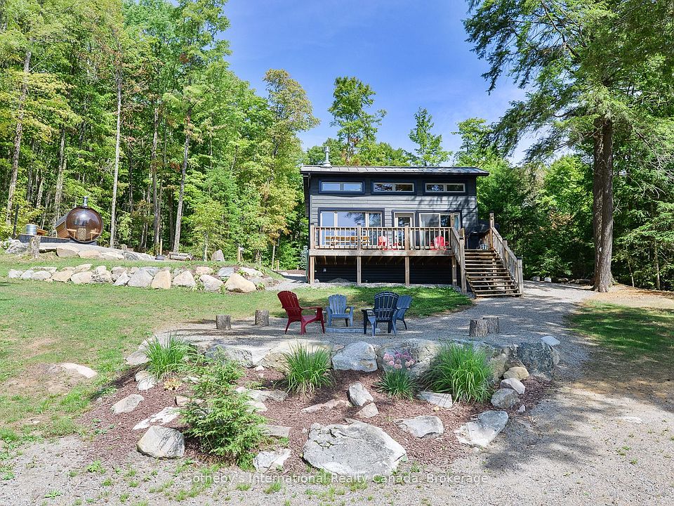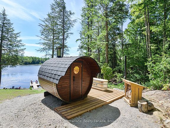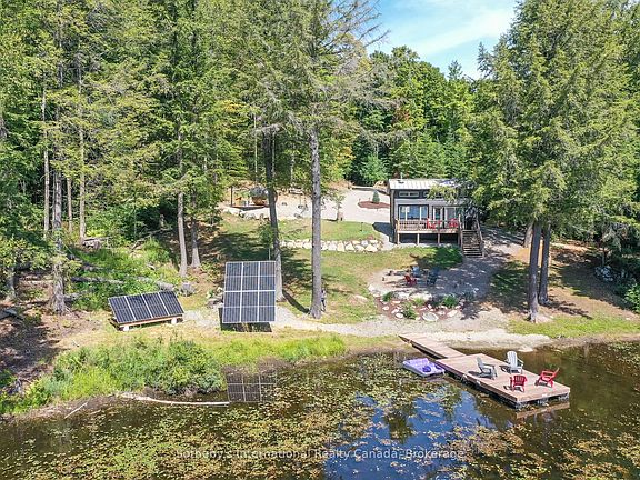 Discover this quiet cottage on Boyne Lake, a Haliburton treasure. Infused with charm, this retreat sleeps 6, perfect for family and friends. The open-concept layout invites relaxation, a functional kitchen space with SS appliances highlighted with a cozy Lopi fireplace and mesmerizing lake views. A unique loft bedroom and a clever Murphy bed offer comfort and space-saving ease. Boasting 300' of lake frontage and almost 4 acres of tiered, treed land, this haven ensures privacy and room to expand. A new 4-bedroom septic system and drilled well support future growth here. Savor gatherings on the spacious deck with a picnic table and the BBQ hooked up to the main propane tank, or unwind by the lakeside fire-pit with family and friends. Ample parking here with a circular driveway that also includes an area for a potential camper/trailer to enjoy stunning lake views and a dock ideal for awesome bass fishing. Indulge in a wellness retreat with the bubble window sauna, cold plunge tank, and an outdoor shower, all with lake-focused views, creating your personal escape. Powered by robust solar panels, tankless HWT and an automatic on-demand Kohler propane generator plumbed to the main tank for seamless reliability, this fully furnished cottage is ready for instant enjoyment. Just 10 minutes from Haliburtons shops, restaurants, and hospital, yet a tranquil escape. This Boyne Lake gem blends rustic allure with modern comforts. Call today to view this off-grid paradise!