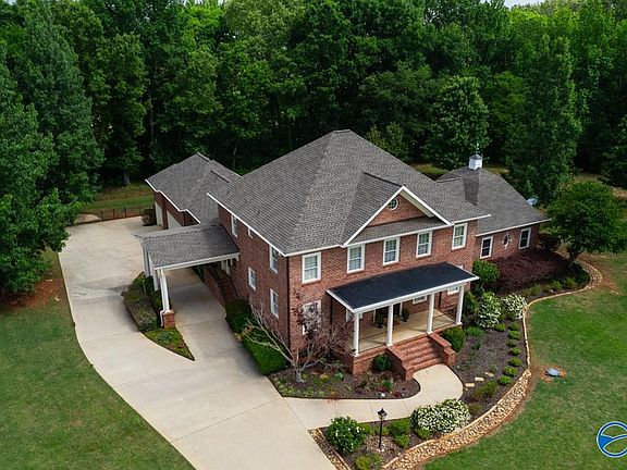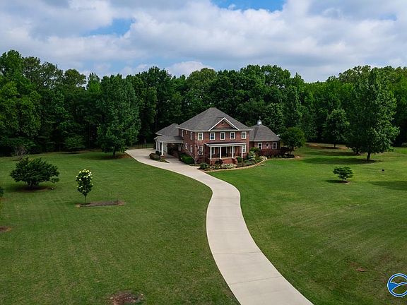 Feel like your living countryside without the inconvenience! Stunning 5 bdrm/6 bath estate bursting with southern charm all situated on 5.6 acres. Near work & play; just N of the TN River/ Wheeler Wildlife & mins from Redstone Arsenal, Research Park, Huntsville & Madison. Exterior details include portico w/ friend entrance & cupola. Inside you will find beautiful Brazilian hardwds in all formal areas & brick tile thr'out most bottom level. 2nd bdrm & study on main. Each bdrm has access to full bath. Large sunroom overlooks backyd. Substantial floored storage above massive 3 car garage, aluminum fenced yard, New first floor HVAC unit ('22) & irrigation system are just a few of many amenities!