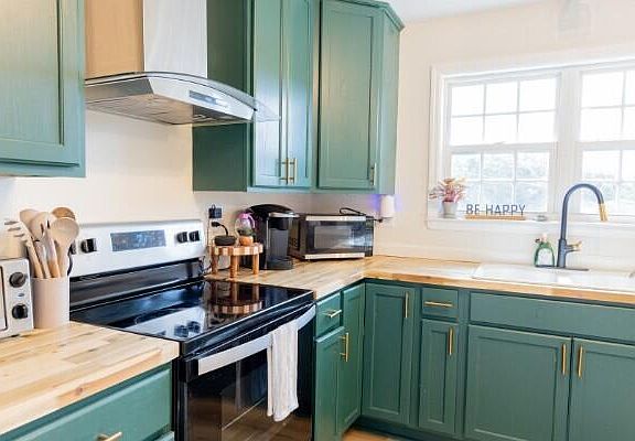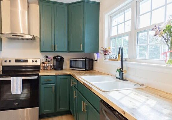 This beautifully remodeled 3 bedroom, 2 bathroom home combines modern updates with warm, inviting charm. The striking black exterior makes a statement, while inside, dark green cabinets stretch to the ceiling, providing both style and plenty of storage.