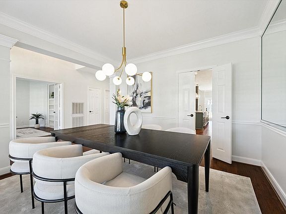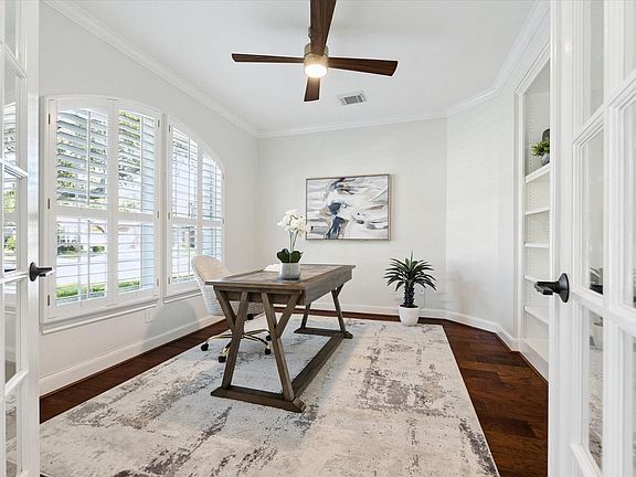 Home officeWood floorsQuartzite countersFlexible layoutFormal diningTwo-story vaulted ceilingsCrisp white brick exterior
