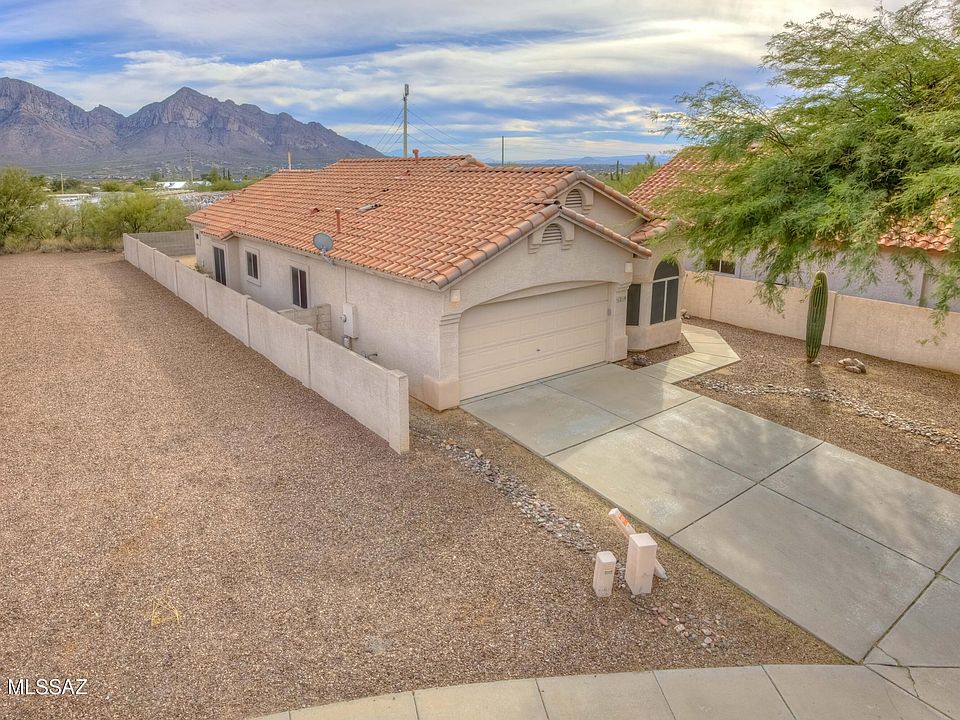 Breathtaking Mountain Views! This charming 4-bedroom, 2-bathroom home is located in desired Overlook Community of Rancho Vistoso. The open and airy floor plan features soaring ceilings, a spacious kitchen with an island, breakfast bar, pantry, and plenty of counter and cabinet space. The primary suite boasts an elegant archway and a peaceful retreat. While this home is in its original condition and ready for your personal touch, it's perfectly positioned next to a vacant lot, offering extra privacy. The generous backyard includes a covered patio and a blank slate to create your dream outdoor space. Conveniently located near top-rated schools, shopping, hiking, medical facilities, and more. Endless potential in an unbeatable location--welcome home!