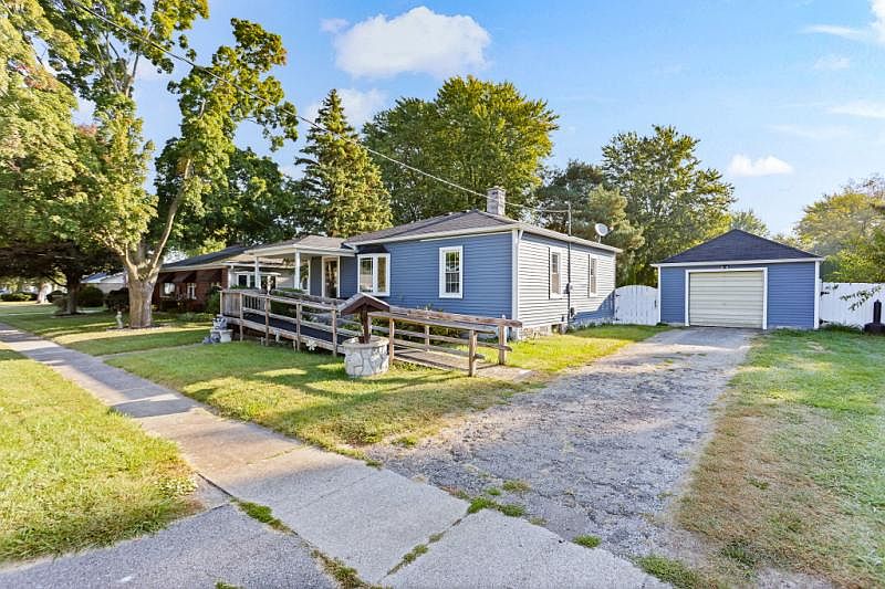 Check out this modern blue sided 2 bedroom, 1 bath home in the quaint village of Birch Run. Hardwood flooring, modernly painted, featuring a bright sunny yellow kitchen, and pantry closet. Appliances stay, full basement for extra space with tons of storage, no neighbors behind, and a white privacy fence for your pup. Covered front porch, nice patio in back yard. The seller put furnace and a/c in when they purchased home, vinyl siding, newer windows, blown insulation added, and pretty stone around basement exterior. Detached 17x24 garage and top it off with a great location on Rottiers for walking. Come home today.