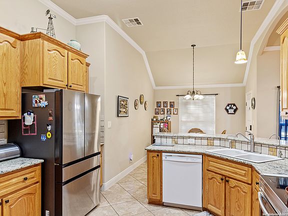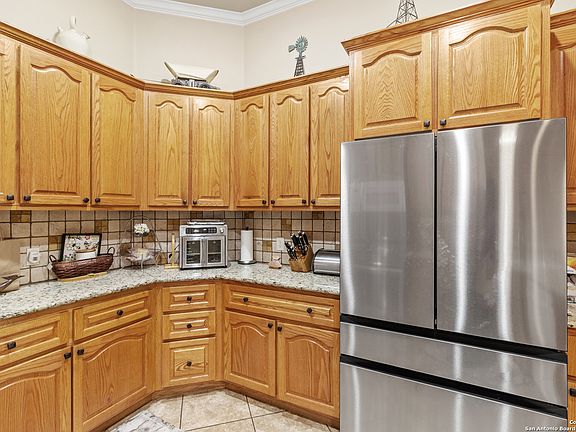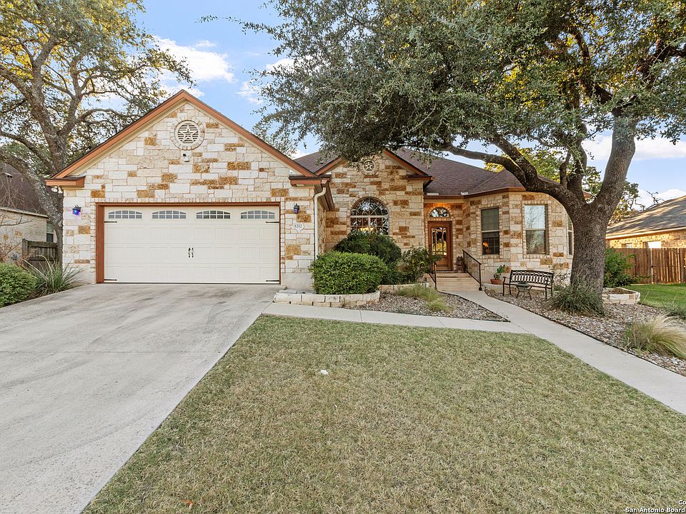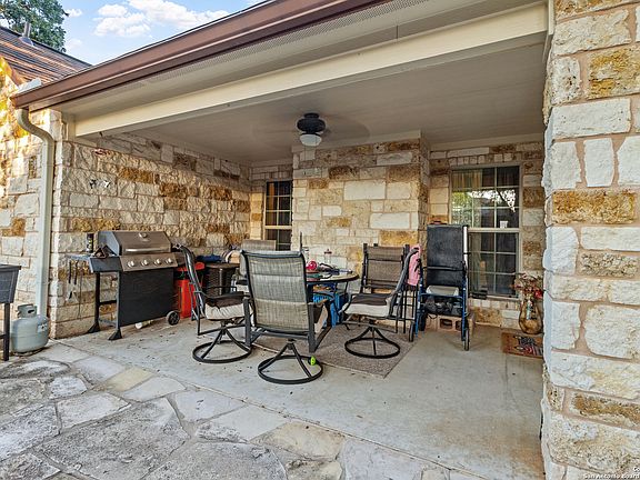 Live the Fredericksburg Hill Country lifestyle in Cross Mountain West-inside city limits and minutes to Main Street, parks, schools, and wineries. Built in 2012, this single-story 3 bed / 2.5 bath home offers approx. 2,201 SF (per builder) on a level city lot with a 2-car attached garage. Classic native-stone exterior opens to a bright great room with a soaring rock fireplace, tile floors in the living areas, and double-pane windows. The kitchen features custom oak cabinetry, granite counters, a breakfast bar with stone front, and adjacent formal dining. Private primary suite showcases detailed ceilings, dual closets & vanities, walk-in shower, and soaking tub. Front office/den with triple windows. Enjoy a covered back patio with stone extension, privacy fencing, and low-maintenance landscaping. Public water & sewer, central HVAC, slab foundation. No HOA-rare city convenience with Hill Country charm.