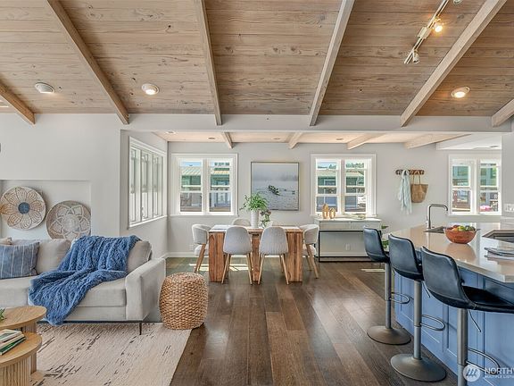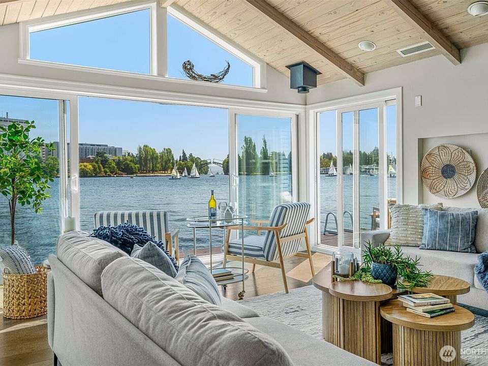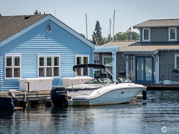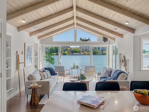 Extraordinarily rare Seattle floating home with stunning unobstructed water views on three sides, with private marina and boat moorage included. Expansive living room and open eat-in kitchen with beautiful, vaulted ceilings. All main floor living, a very rare find, has gorgeous hard wood floors. All the bedrooms have panoramic views and brand-new windows. Enjoy watching winter migratory birds arrive at your head-to-toe windows. 38' of low-bank bulkhead waterfront and two outdoor seating areas, including one with access directly from the master bedroom through sliding glass doors. All new interior and exterior paint. Designed by architect Eric Hogeboom. Home comes with a boat slip.
