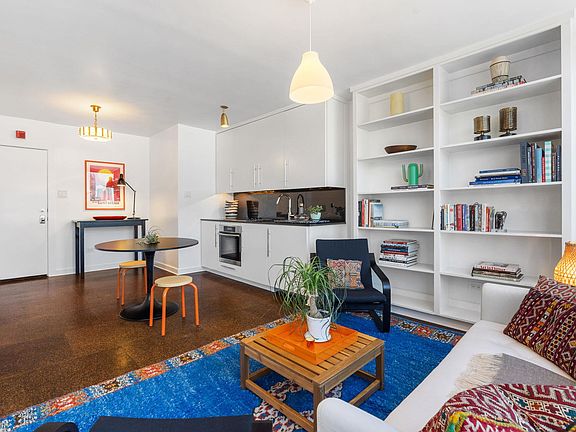 Striking wall of windowsChic high end updatesCustom built-in bookshelvesWarm cork flooringAbsolute black granite countertopMiele appliancesSpacious walk-in closet