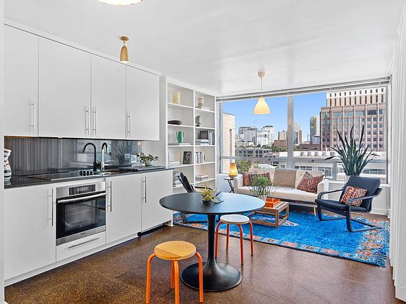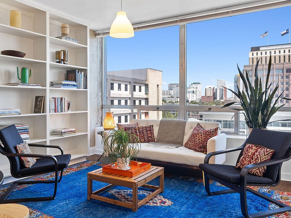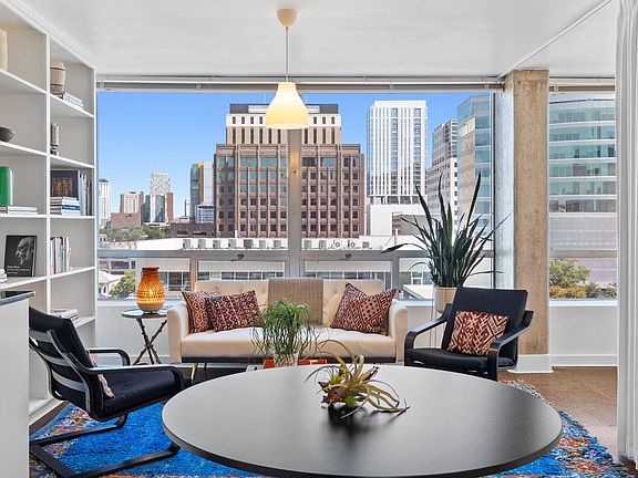 Experience the best of downtown living in this stylishly remodeled condo, perfectly situated just 2 blocks from the Capitol & surrounded by everything the city has to offer. Compact yet brilliantly redesigned by its owner, a well known Austin designer, this 469 sq ft urban gem lives larger than its footprint, creating a smart, open layout w/ chic, high end updates throughout. A striking wall of windows fills the space w/ natural light & frames vibrant city views, while exposed concrete columns add a modern industrial edge & warm cork flooring provides natural texture & warmth. Custom built-in bookshelves offer both function & character in the living room & the spacious bedroom is separated by a floor to ceiling curtain, creating a sense of privacy without interrupting the open flow of the space. The sleek Euro-style kitchen features top of the line Miele appliances, Absolute Black granite countertop & backsplash & minimalist cabinetry that blends seamlessly into the open living space. The bathroom exudes understated elegance, featuring a travertine & mosaic-tiled walk-in shower & a vanity topped w/ Absolute Black granite. A spacious walk-in closet, integrated into this private area, offers a level of unexpected luxury & functionality rarely found in a condo of this size. The Penthouse Condos offer secure, controlled access through a private lobby + professional on-site management. One reserved parking space is included in the attached, gated garage. The affordable HOA dues cover essential utilities such as electricity, water, gas, trash & recycling. Whether you're looking for a full time urban residence or a low maintenance lock & leave pied-a-terre, this sophisticated condo delivers the perfect blend of personality, location & convenience, steps away from downtown restaurants, cafes, nightlife & major employers. Act now & seize this special opportunity to own a residence that has been expertly designed to maximize space & style, all offered at an unbeatable price.