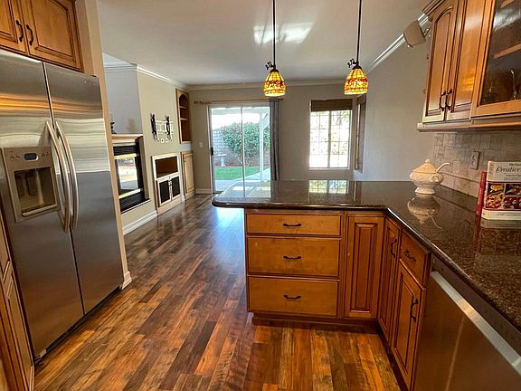 Kitchen remodel with granite and beautiful black-splash, Maple cabinets, newer gas range and dishwasher plus microwave. Decorator lamps add to the beauty of this wonderful kitchen with Breakfast bar. 3 dimensional laminate flooring downstairs, 2 sided gas fireplace with logs. Upstairs are 3 bedrooms with a large master suite and 2 closets, upgraded carpets and more. Rear yard has a nice spa, patio cover and artificial lawn all ready for entertaining. Tankless water heater, roll up insulated garage door. Low maintenance home is ready for you on a cul-de-sac!