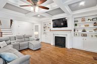 Coffered ceilingsCrown moldingHardwood floorsQuartz countersDedicated movie roomSurround soundSpacious laundry room