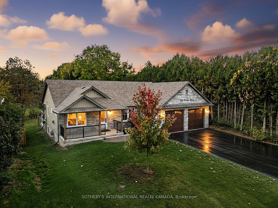 Welcome to the charming community of Colborne, the heart of Ontario's "Apple Route" in the county of Northumberland. This immaculate custom bungalow built in 2017 sits on a large country lot. There is over 2300 sq ft of total living space. The main level boasts a bright open concept living/dining and kitchen, featuring a gas fireplace, centre island and dining area with sliding patio doors to a covered composite deck. There are 3 bedrooms, an ensuite for the primary plus a 4 piece family bath on the main level and direct access to the garage and a 2nd laundry with sink. The current owners have invested significantly in upgrades since purchasing and include: new neutral flooring on the main and lower level, high quality stainless steel appliances in the kitchen, a completely finished lower level with above grade windows for natural light which includes a family room, plus 2 additional bedrooms. One bedroom with a semi ensuite and 4 piece bathroom. There is a dedicated laundry room with front load washer and dryer and laundry sink and a generous sized utility room with new water softener system. Pot lights throughout and under cabinet light in the kitchen. The outdoor living space is incredible with a covered front porch and 3 separate composite decks in the backyard. There is a 6 person hot tub which is only 2 years old. A covered deck off the dining room, plus a covered and panelled area for the hot tub area provides natural light and tons of privacy. A full Generac system powers the whole house for your peace of mind. Extra spacious 2 car garage with innovative hanging storage system , provides additional storage without impacting 2 car parking in the garage. A heat/air conditioning unit has also been installed for year round comfort while working on projects in the garage. Natural gas and municipal water. A short walk to downtown Colburne with shops and restaurants and 10 minutes to Brighton. Less than 1.5 hrs to the GTA.