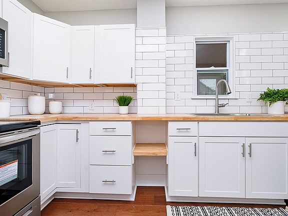 Stylish half bathCharming covered front porchSpacious kitchenStainless steel appliancesButcher block countertopsWhite cabinetryRich hardwood flooring