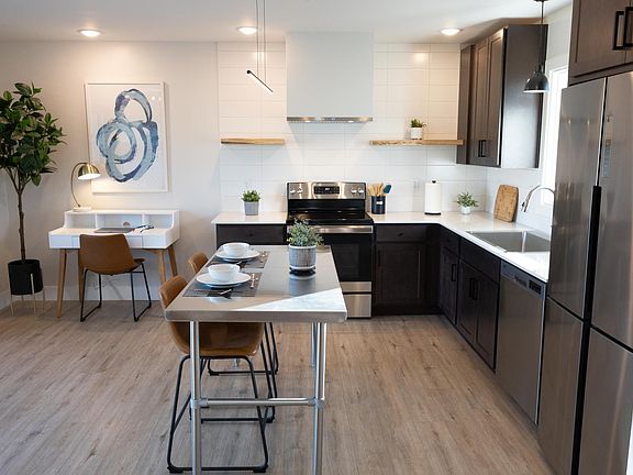 FURNISHED EXECUTIVE APARTMENT with full kitchen, washer+dryer, private balcony + mountain views, and gated off-street parking for only $88/night - newly built in 2022! 1 bedroom / 1 bath with modern finishes, designed with traveling professionals in mind. Includes a fully equipped kitchen, stainless steel appliances, quartz countertops, tiled shower with bathtub, modern heating and cooling system, full sized washer/dryer in each apartment and tasteful mid century modern furnishings. Large screen smart TV includes a long list of channels, highly rated new queen mattresses and crisp white linens.
