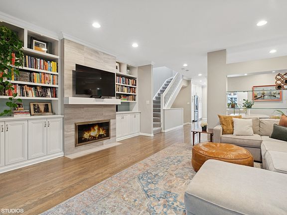 Welcome to this sun-filled, renovated 3-story townhome in the heart of Lakeview, tucked away in a quiet, gated, tree-lined community near Margaret Donahue Park. This end-unit home lives like a single-family-fee simple with no monthly assessments-and is the largest in the complex. South-facing windows fill the space with natural light and offer views of charming School Street. As you enter the ground floor, you'll find a large family room/recreation space with a half bath, large separate laundry room, great storage, and a 2-car garage with additional storage above. This level is easily used as a 4th guest bedroom + office. The 2nd floor is drenched in sunlight with an open kitchen with white cabinets, quartz counters, and a J Boos Walnut Butcher Block island. The kitchen flows into a sunny dining room, and a cozy living area with nice bay windows, a gas fireplace, and beautiful custom built-ins. The 3rd floor has a sought-after layout with three spacious bedrooms up, and two full baths. Enjoy outdoor living with a large deck off the kitchen and a private front yard bordering the park. Walk to Southport Corridor, Wrigley Field, and highly acclaimed Hamilton Elementary.
