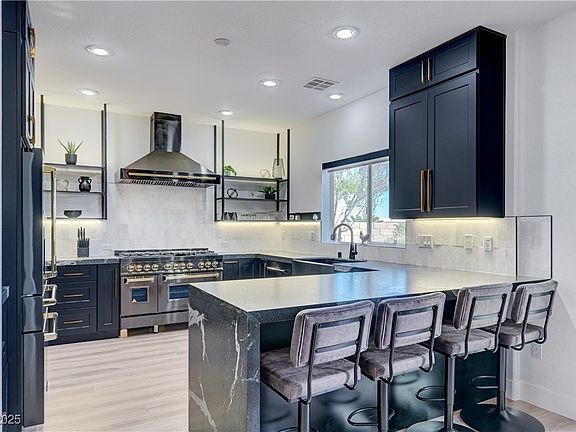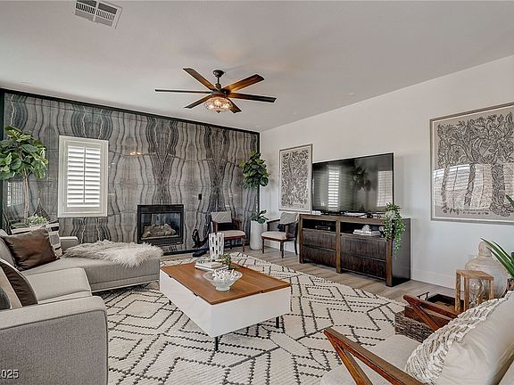 Introducing a beautifully transformed home, where every detail has been carefully curated. The redesigned gourmet kitchen showcases a stunning breakfast bar, custom cabinetry with soft-close features, exquisite handcrafted marble tile, a striking backsplash, & elegant black granite countertops. Embrace the warmth of the inviting family room, complete with a fully tiled wall and a gas fireplace, while the stylish center bar area impresses with its sophisticated stonework & wine fridge. The primary bathroom offers a spa-like escape, featuring a seamless glass walk-in shower, a freestanding tub, & a window that frames breathtaking views of the city's twinkling lights at night, as well as the spectacular STRIP and MOUNTAIN vistas from the balcony. Step outside to your serene private backyard oasis, perfect for relaxation, featuring a covered patio, pool, spa, and ambient landscape lighting. No expense has been spared on this extraordinary home—it's an absolute must-see!