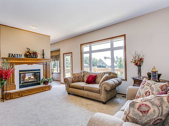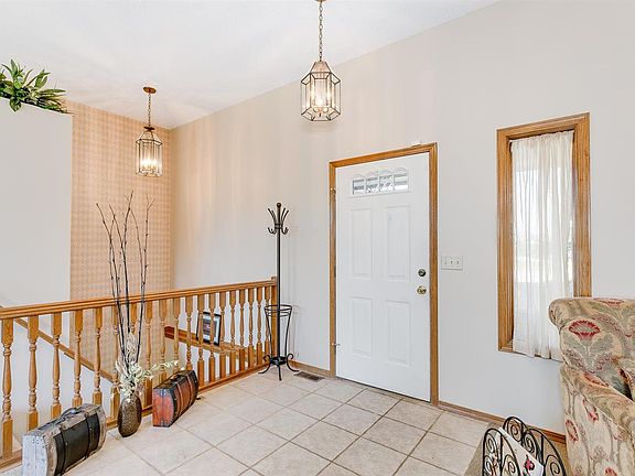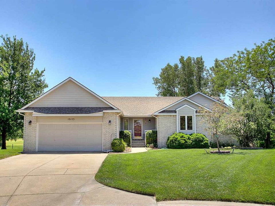 Don’t Miss this Meribeau Beauty! 5 bedrooms, 3 bath, 2 car garage on desirable cul de sac lot with backyard farm-like setting/view. Nice curb appeal and landscaping. Sprinkler system with irrigation well. Sellers have taken great care of home over the years and updated nicely! Mostly all new windows replaced several years ago, all new furnace & air conditioning in 2013, gorgeous new main floor carpet 2015, new interior paint 2015 and new deck and front porch railing. Open floor plan with tall vaulted ceilings and space galore. Master bedroom has walk out to deck, tall coffered ceiling and nice bath with jetted tub, separate shower and separate sink/vanity for makeup area. Large walk in closet with shelves. Main floor laundry and drop zone. Kitchen is huge with tile floors, pantry, island and tons of cabinets and counter space. Kitchen dine in casual eating space plus formal dining area. Two way fireplace upstairs to enjoy from kitchen, hearth and living room plus a three way fireplace in the basement which can be seen from family room, rec room and wet bar area. Basement features family room with built in desks, wired for surround sound (no speakers just wiring), recreation/entertainment area and large wet bar w/room for full sized refrigerator and has ample cabinets and storage. Three bedrooms downstairs, two with view out windows. Full true walkout to spacious yard with covered concrete patio plus another concrete pad with basketball goal and opens to farm like setting. Goddard schools and great neighborhood with swimming pool, playground and lake/pond. Kitchen refrigerator and washer & dryer are negotiable.
