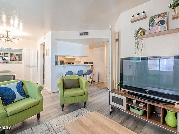 One bedroom, one bath + office or 2nd bedroom. End unit on north side of 2nd floor. Elevator, stairs, and parking spot are close to condo. Cozy well maintained condo can be used as primary residence or rented as an Air BNB/Short term rental. Property is fully furnished and turn key. Stacked washer and dryer are included. Recently updated with wood like vinyl flooring. Unit has a reverse osmosis system in kitchen. Condo is close to grocery stores, shopping, restaurants, spring training parks, entertainment, and the 101 Freeway.