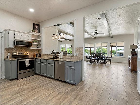 Lakefront dream with amazing sunsets off back porch! Completely remodeled in 2022-2023 with 4 large bedrooms and 3 full baths and a large beautiful open view in living room of the lake. The entire North side of property is lakeside. The open floor plan is so flexible for any families needs. There are 2 bedrooms on one side of home and 2 bedrooms on the other side of home. One bedroom is a gameroom/ bedroom and another is a bedroom/office with a door to the driveway which is perfect for a home business or office. There is an awesome outdoor patio with an abundance of seating area and cooking area and it has a nice hot tub on North side of patio that was purchased in 2023. Nice large shop/horse barn behind home looking toward lake. It is 40' x 75' with a 40' x 13' patio area on front entrance. 2 large slide open doors and 8 small slide open doors on sides of shop. It also fully concreted throughout the shop and has electricity. There are 2 tool rooms with doors that can also be locked up. There is a nice stocked pond on property also and great blackberry bushes close to pond! Wild game everywhere. Ducks and Geese fly into the cove behind home every morning and deer come up behind barn a lot. It is very peaceful and private! There is a public boat ramp right behind property but you have to take gravel road to the South of home to get there. It is not very busy because there are no signs anywhere on the roads or Hwy 9.