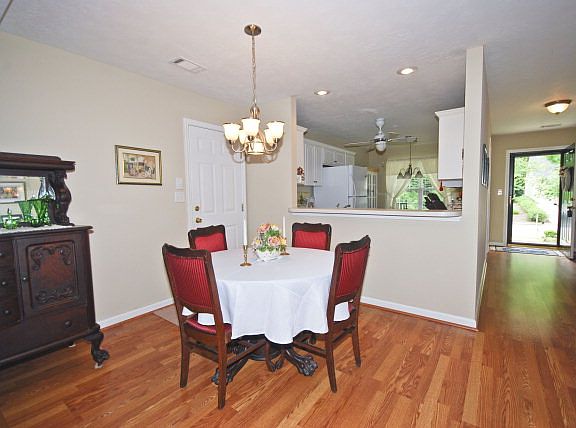 Home w/many upgrades including ceramic tile in all baths & kit, upgraded kit w/glass front cabinets, built in microwave, fridge that stays & dishwasher never been used! Laminate wd flring in sunrm, ceiling fans, upgraded carpet & 2 inch blinds throughout! Beautifully landscaped front & back! Plus is an end unit & quiet location! Central laundry rm w/newer washer dryer that can stay! Move in ready!