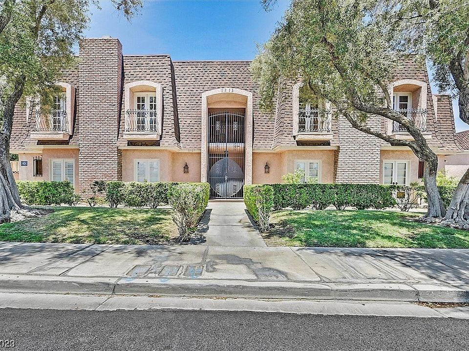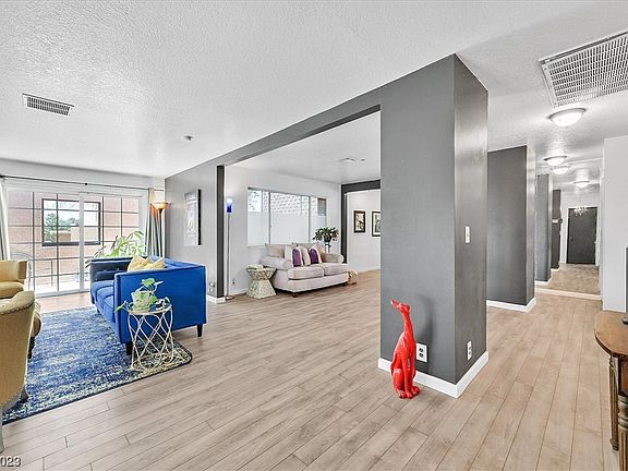 RARE MARYCREST MANOR 2 BEDROOM, 2 BATH CONDO-NEXT TO THE HUNTRIDGE HISTORIC NEIGBORHOOD & THE ARTS DISTRICT + an abundance of downtown Las Vegas culture & nightlife--Walking distance to Central Technical Training Academy, Global Community High School and two churches. Enter the great room featuring dual-pane French doors leading to 2 balconies and ONE enclosed deck with some Strip views! Cozy gas fireplace with custom wood framing and sconces. Vinyl wood flooring thru-out-custom 2-tone paint with accent walls-new light fixtures-kitchen features concrete counters and S.S. appliances, commercial grade faucet with a granite composite single bin sink-charming dining area off of the kitchen has double pane French doors that lead to a tiled terrace for morning coffee or evening cocktails-Spacious primary suite with newer carpet and huge walk-in closet-Guest bedroom has newer carpet and mirrored closet doors and access to the terrace. Detached 1 car garage also has a sizable storage closet.