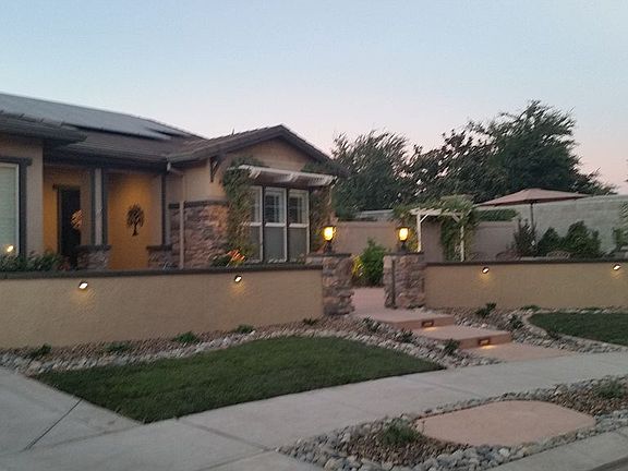 This beautiful Del Webb Home has been remodeled and updated several times beginning in 2012: Custom quartz kitchen counters, state of the art appliances, huge lowered, gourmet kitchen island w/composite granite sinks, oil rubbed bronze fixtures and custom lighting/fans, crown molding, paint and plantation shutters installed throughout the 10' ceiling home. Custom pantry by CA Closets w/ custom stained glass door by German Glaswerks, soft closers and pull-out drawers in all cabinets. Tiled great room with two 8' French doors also features custom floor-to-ceiling lighted entertainment center, custom slate fireplace, automatic fireplace fan, kitchen nook w/2 larger windows added. Two, lighted glass door kitchen cabinets and recessed lighting above and below all cabinets. Formal dining room w/three front windows, exterior 8' tall french doors, tin ceiling, California Mission Olive hardwood flooring with European hand-inlay wood medallion, custom lighting throughout. Beautiful office, (could be a third bedroom), w/built-in custom counter/cabinets below double glassed in bookcase to 10' ceiling. Indoor laundry w/sky tube lighting and added 8' closet doors with extra shelving, hall half bath with sky tube. Larger, tempered, plate glass window over owner's Roman tub w/custom tile. Owner's walk-in closet with sky tube lighting, custom closet by CA Closets, custom hall linen closet by CA Closets, and 8' closets added in guest bedroom with additional shelving above, private sliding glass door entry to guest bedroom with fully updated, glass enclosed bath with tub combo. Both bedrooms feature plush wall to wall carpeting. Whole house fan, covered patio, and 2.5 car garage with finished walls, composite flooring, custom closets and overhead storage with automatic ceiling ventilation fan. In 2014, 22 solar panels added and paid in full. Outside, custom large spa/lap pool added with shelf seating all around and 10 jets, lighting, and three sheer descent water features. Lush landscaping with automatic lighting/irrigation and custom pressed, tinted sidewalks, six white painted aluminum awnings/pergolas around the home. One lighted, three tiered fountain. One outdoor storage shed. In 2016, a huge, lighted, custom color paved front courtyard added with two custom made iron, self-closing gates, planters, carriage lights, and drought tolerant landscaping with drip irrigation, automatic lighting. Outdoor security alarm system added in 2022, recording security cameras on all sides and Ring security camera/floodlights over garage, facing cul-de-sac, all with cellphone notification/monitoring. Activated alarm system registered with local PD. In 2020, solar reflecting screens installed on all west windows/glass slider and outdoor trim repainted. Neighborhood Description This is a lovely, custom Del Webb home for age 55 plus with all of the extra appointments a quality builder affords. Although there are no children residents, they may visit owners here, i.e., grandparents, and enjoy specific hours set aside in the community pool!