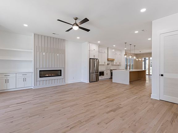 Modern electric fireplaceWalk-in pantryCity viewsWaterfall islandOpen layoutBeautiful kitchenWet bar