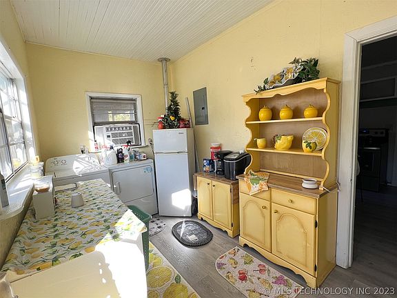 Charming Farmhouse With NEW ROOF on .71 acres in A Quiet Neighborhood setting on the edge of Drumright! Must see! 1418 Square Ft, 3 Bedrooms, 1-1/2 Bath - Plus 3 Bonus rooms that could be used for office space, extra bedrooms etc! Extra Storage space in hallways and pantry in kitchen, Updated Windows, NEW Central Heat and Air 2022, Aerobic Plumbing System. Laminate Wood flooring, Carpet & Tile,