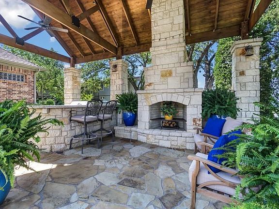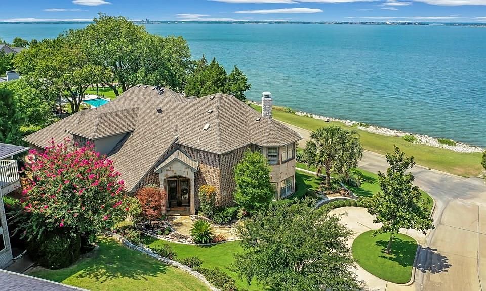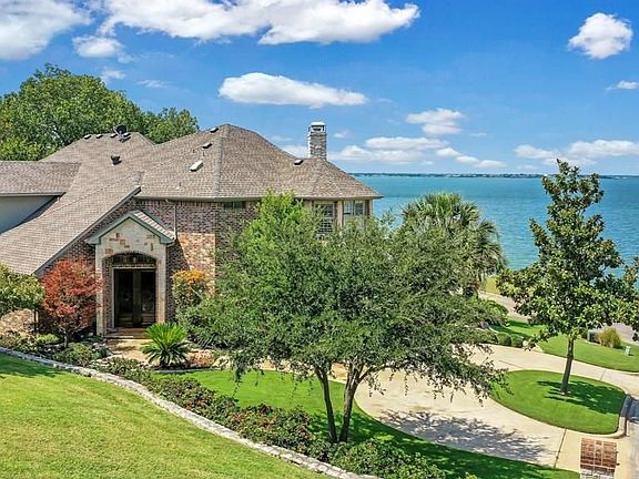 Only 9 miles from George Bush Freeway, enjoy this rare find - lakeside living at its best in this spectacular Austin stone and brick custom home with unobstructive lakeviews, circular drive, lushly landscaped lawn, incredible covered outdoor living area with summer kitchen and outdoor fireplace and near great schools, shopping, marinas/yacht clubs and Rockwall's Harbor. Attention to detail is obvious the moment you enter. Austin stone arched doorways welcome your arrival and open onto family room complete with custom built ins, hardwood floors, plantation shutters and stone accent wall. Second living area features towering ceilings, custom built ins, Austin stone fireplace with custom wood mantle, floor to ceiling windows with custom plantation shutters providing stunning lakefront views and opens onto kitchen and breakfast area. Chef's dream kitchen includes upscale commercial style stainless steel appliances including Dacor gas range with double ovens/griddle, built in refrigerator/freezer and dishwasher; tons of custom wood cabinetry, granite countertops, walk in pantry, island and breakfast bar. Kitchen opens onto lovely breakfast area complete with Austin stone fireplace. Downstairs master suite features gorgeous master bedroom that includes sitting area and plantation shutters and incredible lakeviews. Master bedroom opens onto master bath complete with his and her vanities with makeup vanity, spa style shower, soaking tub and walk in closet with built ins. Gameroom/media/playroom can double perfectly for guest bedroom. Three auxiliary bedrooms are complete with roomy closets. Other amenities include recently replaced roof, windows, 2 4 ton Trane HVAC units, fresh interior and exterior paint, custom wood shutters throughout, new pump for watering lawn from lake, stone retaining walls, flagstone walkways and so much more! Enjoy lakeside living!