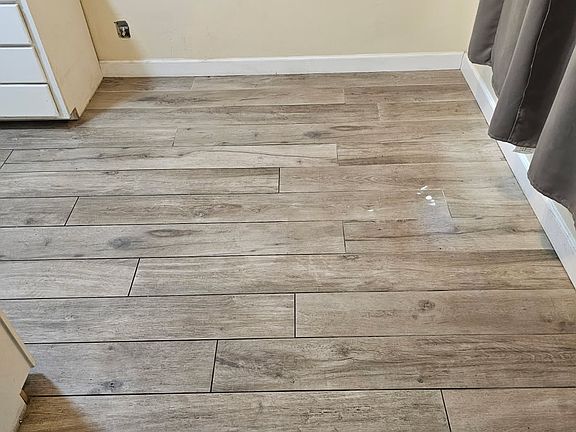 This apartment features recently installed flooring, a white tile bath-shower combo, and comes with access to an on-site washer and dryer.