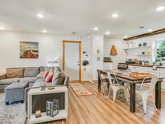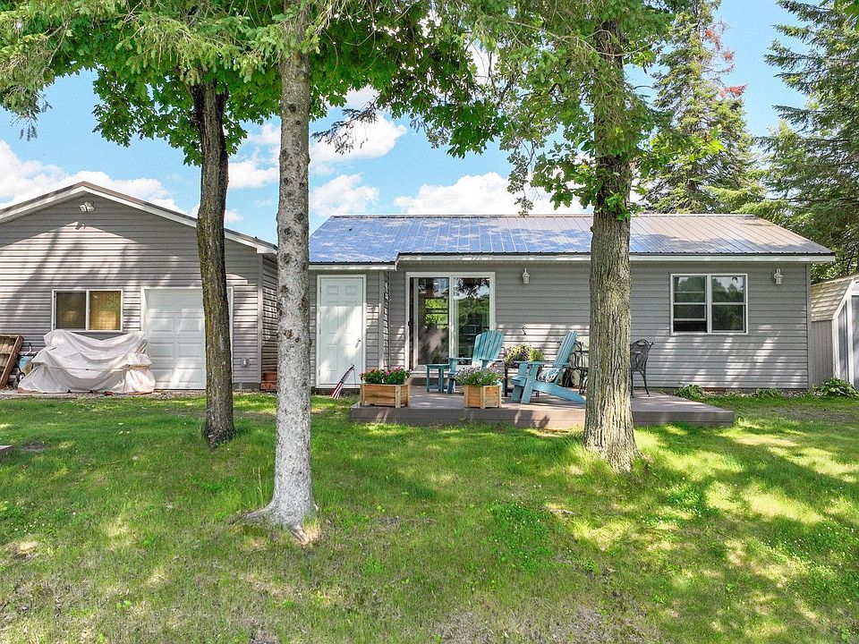 Welcome to your peaceful lakefront retreat on Big Trade Lake! Charming 2-bed, 1-bath cottage is tucked away on a quiet dead-end road and is being sold turnkey, so you can start enjoying the lake life right away! Inside, you’ll love the cozy yet modern touches: VLP flooring throughout, butcher block countertops, white shiplap walls & knotty pine 6-panel doors. The open kitchen and living area feature stainless steel appliances and lake-facing windows & a patio door, providing incredible westerly sunset views over the water. Step outside to an expansive 18x16 maintenance-free deck, perfect for relaxing or entertaining with serene lake views. Outside: A garden shed with a trendy vaulted tin ceiling, 2+ car detached garage with two overhead doors (one opens to the backyard), workbench, and plenty of room for lake gear. With 97' of shoreline, tranquil surroundings, & being sold turn key, this is the perfect property to make year round memories for years to come.