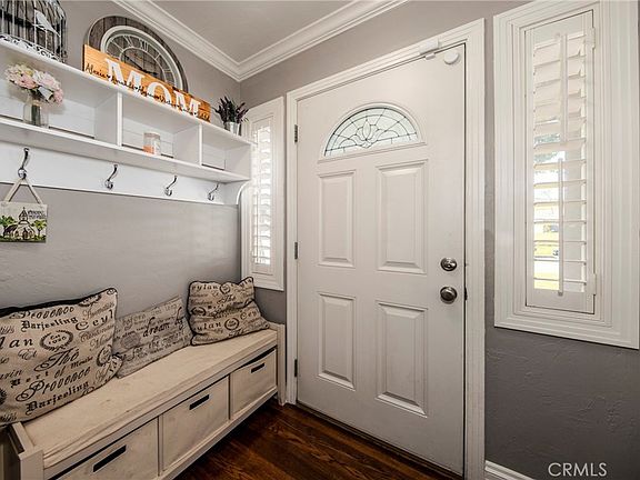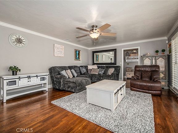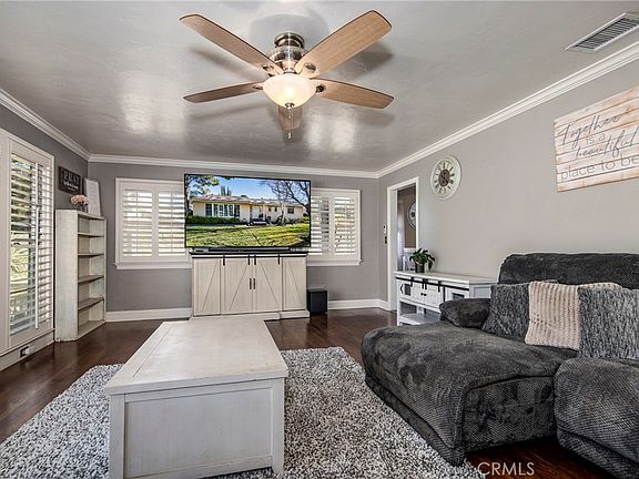 Welcome home! This single-story, cozy modern with 50's retro features is situated in a quaint and quiet neighborhood. The cute entry leads to the bright and airy living room with tons of windows and beautiful wood floors. The lovely dining room is connected to a bright kitchen with lower cabinets and open upper shelving, and newer wood laminate flooring. The main living areas and the bedrooms feature crown molding and modern tall baseboards. Two bedrooms have brand new or nearly new carpet and the primary bedroom features a walk-in closet and a charming 50's style ensuite. Enjoy the comfort of a newer central AC and heat system. The large yard includes a fenced back yard, covered brick patios, fenced garden, and outdoor shower. The back yard features many fruit trees, including lemon, orange, crab apple, raspberries, and blackberry bushes. The back fence is lined with palm trees and there is also RV parking and a double garage with a brand new garage door. Quick access to the 10 freeway and great shopping. Don't miss out on the opportunity to own this charming home!