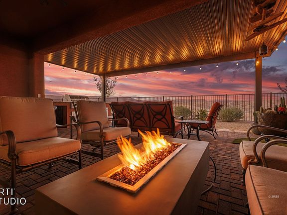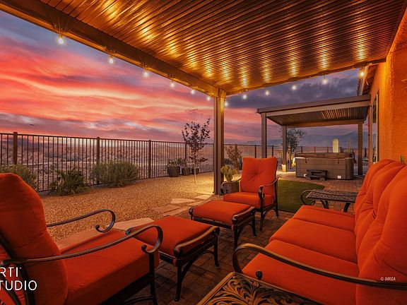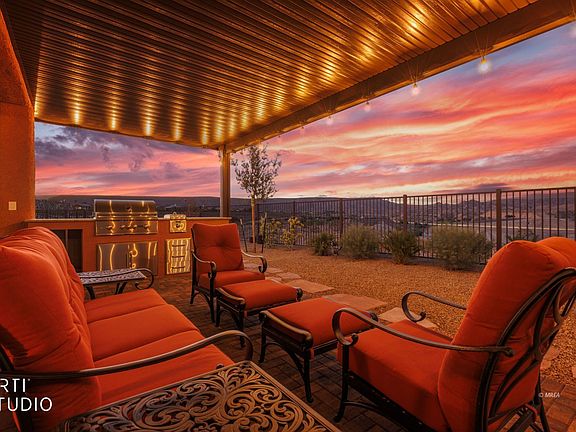 Stunning Panoramic Views on .27 Acres with Golf Cart Garage. Stunning panoramic views on .27 acres! Nearly new 2BR/2.5BA + den with golf cart garage. Enjoy 10' ceilings, 8' doors, plantation shutters, ceiling fans, and luxury vinyl plank flooring. Kitchen features quartz counters, RO system, semi-circular island, pull-out shelving. Butler bar and desk area with quartz countertops off the kitchen. Den includes built-in desk; great room offers media niche with fireplace and lit glass shelves. Bedrooms have ensuite baths-primary with dual vanities, tiled walk-in shower and large closet; guest with tub/shower and grab bars. Laundry room boasts ample cabinetry, work surface, and built-in ironing board. 2-car garage is climate-controlled with ceiling storage racks. No need for a trash can inside garage--includes a dedicated outdoor trash enclosure. Outdoor living shines with extended paver patio, awning, firepit, outdoor kitchen and walkway to hot tub under second awning. Landscaped yard and cacti garden glow with low-voltage lighting. Community amenities include indoor/outdoor pools and hot tubs, tennis, pickleball, bocce ball, 18-hole putting green, state-of-the-art gym, indoor walking track, clubs, activities & discounts at Conestoga Golf Club.