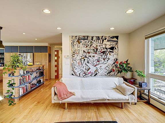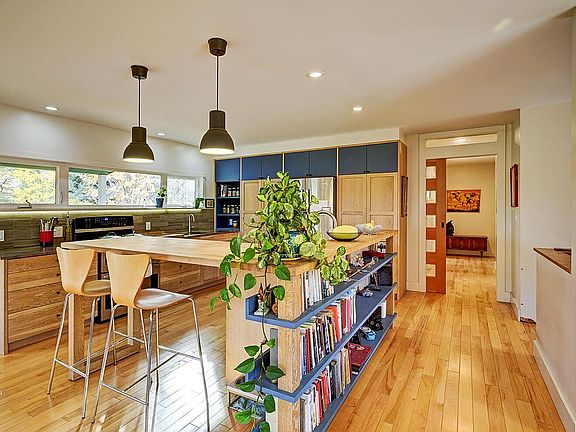 Great light, view, trees, neighborhood and yard. The backyard is huge and about half is dedicated to trees and a permaculture food forest with berries, grapes, herbs, bees and birds. Wooden deck and flagstone patio.