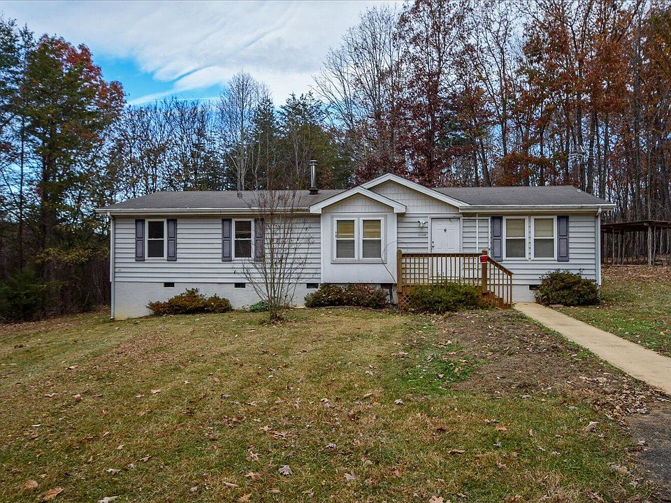 Nestled on a private 5 acres, this 4 Bedroom, 2 bathroom home offers easy one-level living. The open floor plan offers a spacious kitchen with large island and pantry closet, dining area, formal living room, laundry, true primary suite w/ en suite bathroom, soaking tub and walk-in closet, plus 3 additional bedrooms. Exterior boasts expansive deck. carport, and storage shed. This property is conveniently located just minutes to Smith Mountain Lake State Park.