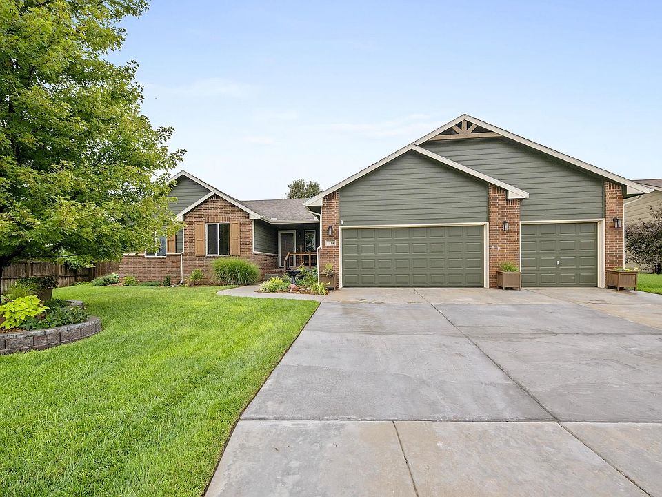 Welcome home to this well-cared-for, impeccable ranch in the desirable St. Andrews neighborhood—just minutes from Goddard Eisenhower schools, shopping, and parks. With over 2,900 finished sq ft, 4 bedrooms, 3 baths, and multiple living spaces, this home is designed for both comfortable everyday living and easy entertaining with special touches throughout. From the moment you arrive, the covered front porch & rustic accents with professional landscaping set the tone for the inviting atmosphere inside. Step into the open concept living area, where a cozy gas fireplace anchors the living room and flows seamlessly into the kitchen and dining space. The kitchen is a chef’s delight with granite countertops, travertine backsplash, granite sink, and wood laminate flooring. A main floor family room sits just steps away—perfect for family game night, a craft room, home schooling or gatherings. The main floor laundry with large pantry adds convenience to daily routines. Your primary suite is a true retreat, featuring a walk-in closet, double sinks, jetted tub, and stand-alone shower. Two additional bedrooms and a full hall bath complete the main level. The finished daylight basement expands your living space with a huge family room currently set up as a home theatre—complete with in-wall and ceiling speakers, projector and screen that all stay. A 4th bedroom, 3rd full bath with walk-in shower, and a dedicated office provide the perfect setup for guests, hobbies, or remote work. Step outside to enjoy the large backyard with a deck covered by a pergola, playset, mature trees, vegetable garden beds, wood privacy fence and more landscaping—plenty of room for entertaining or for kids to play. A sprinkler system and three-car garage add even more value. Close to shopping, churches, restaurants. Newer basement carpet and wood laminate flooring. Located in the sought-after Goddard School District on the Eisenhower Campus, this home combines small-town charm with modern convenience—offering everything you need for today’s lifestyle. Don’t let this charming ranch home get away – call for your own private showing today!!