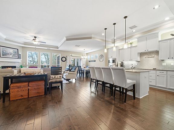 Welcome to this spectacular patio home on a huge mature treed lot for the ultimate in privacy. This meticulously maintained Patio Home has a fantastic open floor plan with incredible views from every room. As you approach the residence, a sprawling covered front porch beckons, offering a perfect spot to savor the outdoors and welcome guests. Step through the glass appointed door into the true entryway, adorned with arched openings, window, and a convenient entry closet. The open floor plan unfolds seamlessly into the grand great room, boasting 10ft ceilings with crown molding, a stone-faced corner fireplace with fans, and three large windows plus a ceiling fan for comfort. The heart of the home is the fabulous kitchen, featuring quality stair-stepped white cabinets, a spacious island with a granite top and eating bar, lazy susan, corner glass display cabinet, stainless steel appliances including a Miele dishwasher, GE built-in wall oven, microwave & glass cooktop, undercounter & over-cabinet lighting, and a pantry. The adjacent dining room is perfect for everyday dining while enjoying a parklike view, three celestial windows and a patio door with a transom for access to the screened-in patio. For formal dinners there is an open dining area in the center of the home, the space can be used as a music room, reading area or open office. The double door entry to the master bedroom is showcased with the glass shelved display nook, 10ft ceilings with crown molding, three celestial window, and a ceiling fan. The sitting area off the master is a great place to hideout with windows overlooking the treed yard and patio doors. The master bath is equally impressive, featuring a double vanity with granite tops, decora mirrors, a zero-entry walk-in tile shower with a seat, and a large walk-in closet complete with built-in dressers and off-season storage. The second bedroom, located at the front of the home is split from the master and offers a large window, ceiling fan and walk-in closet with sweater rack and off season storage. Additional highlights include an impeccably designed hall bath with an oversized vanity with granite top, decora mirror, tub/shower with a can light, and tile floor. The separate laundry room off the kitchen is a functional space with cabinetry, a hanging rod, sink, a huge walk-in storage closet and access to the master bath. The oversized garage, measures 23x25, is fully drywalled and equipped with a window, opener, gas line for heater and 220 outlet. For outdoor enjoyment there is a fantastic screened-in patio along with an oversize patio for barbequing and entertaining. The home backs up to a large common area with mature trees on the east side of the home which will shade the patios in the heat of the summer. Don't miss your chance to call this exquisite property home!