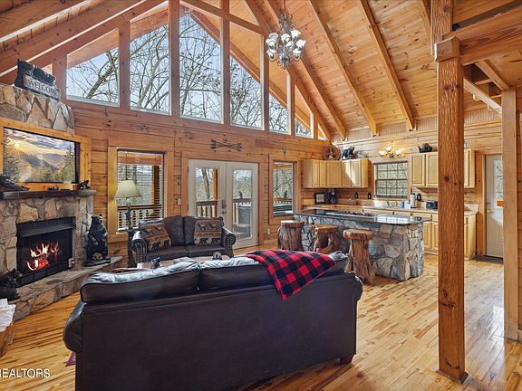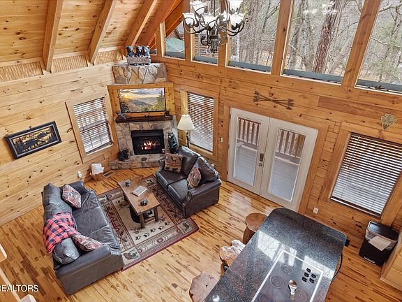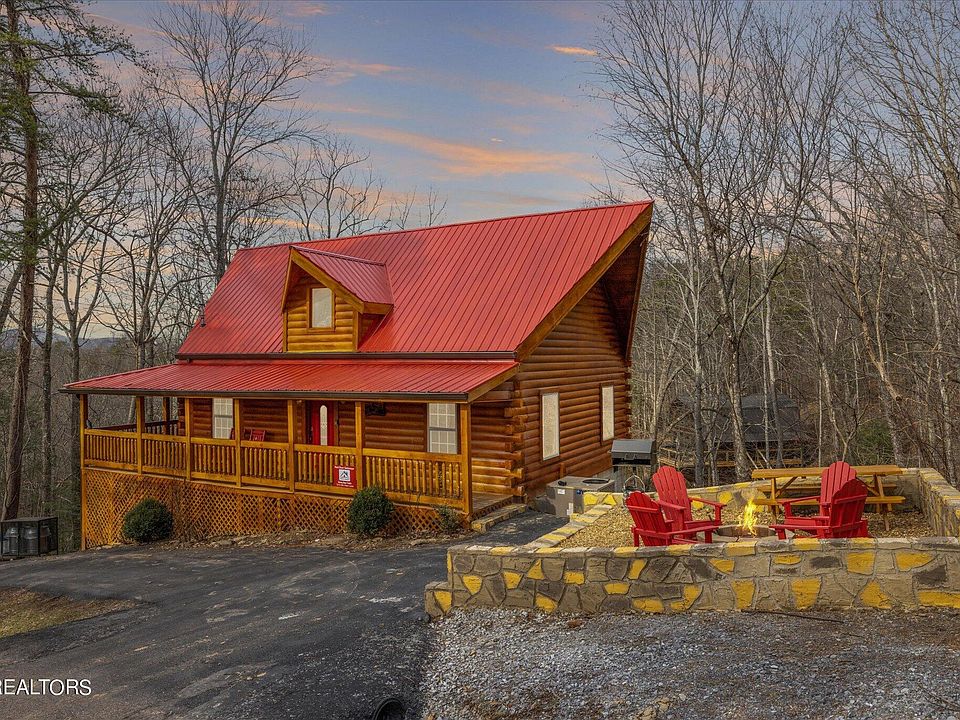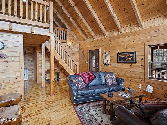 Amazing find! A True Log cabin in the Smoky Mountains. Conveniently located between Gatlinburg & Pigeon Forge. Wonderful 2BR 2BA cabin with a loft, and a huge wrap around porch. A great investment opportunity. This cabin is performing well on short-term rental and has a projection of $60K for 2024. The interior features all wood interior, beautiful cathedral ceilings with huge windows. A cozy gas log fireplace and new furniture in the living room. The kitchen offers a fabulous island and all new appliances. The loft is equipped with a pool table and games. Tastefully decorated throughout the cabin and it is being sold turnkey...fully furnished. Another great feature is the new outdoor fire-pit with a picnic table and seating. More recent improvements to mention are... a new metal roof, polywood chairs, gutters, exterior staining, new flooring in the loft and in one bedroom. The HVAC is 6 years old.