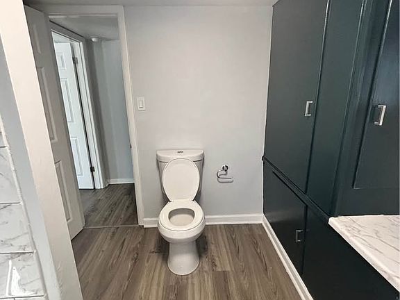 Brand-new ac unitsExtra cabinet storageBuilt-in shelvingModern gray wood-grain flooringBright kitchenBold deep-green cabinetsSpacious bathroom