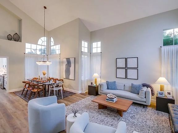 This stunning upgraded masterpiece is perfectly situated on a spacious quarter-acre corner lot at the end of a quiet cul-de-sac. The open floor plan seamlessly connects the living, dining, and kitchen areas, streaming with natural light and soaring ceilings. The interior features newer luxury vinyl plank floors, designer paint, and a modern staircase that adds a custom home feel. The recently remodeled chef's kitchen boasts new custom cabinetry, quartz countertops, a contemporary tile backsplash, a walk-in pantry, pendant lighting, and an oversized island. The main floor includes a versatile bedroom with a full updated bathroom and a large walk-in closet with custom shelving. The primary bedroom is an elegant retreat with vaulted ceilings, a stunning spa-like bathroom, and a walk-in closet. Outside, enjoy the covered patio entrance to your private oasis, complete with a BBQ island and a saltwater pool and spa with a Pebble Tec surface, all offering stunning mountain views—ideal for relaxation or hosting gatherings. This home also includes a 3-car attached garage and ample driveway parking, providing plenty of space for parking and storage. Additional benefits include no HOA fees or Mello-Roos, easy access to freeways, restaurants, and shopping, and close proximity to the award-winning Poway Unified Schools. Don’t miss out on this unique opportunity to own a piece of Poway paradise!