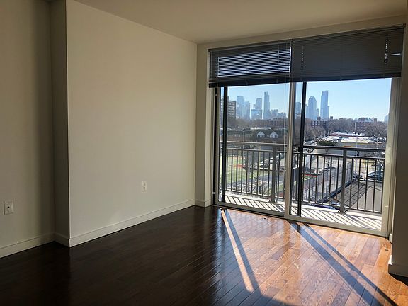 This airy, gut-renovated one-bedroom features Manhattan skyline views, hardwood floors, sleek modern finishes, central air, a private balcony, a dishwasher, and an in-unit Bosch washer/dryer.