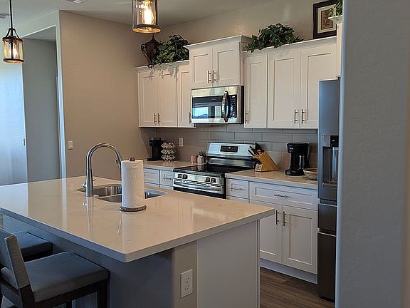 Shady covered patioBeautiful mountain viewsFull paver drivewayVegetable garden planterFruit treesTile backsplashQuartz countertops