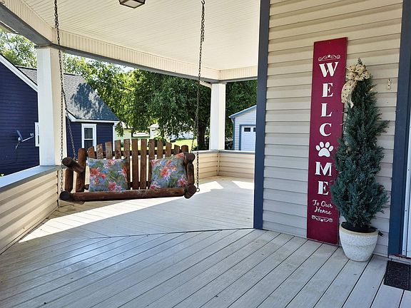 Step inside this charming 1910 foursquare home and you’ll be greeted with original mission-style woodwork, complete with colonnades and built-ins that separate the dining room from the living room. The open staircase splits at the landing, giving you easy access to both the kitchen and the living spaces The home has seen many thoughtful updates, including gleaming wood floors and an updated kitchen with newer cabinets and a unique movable island that easily rolls into the dining room to serve as a buffet. The main floor also offers an updated half bath, original working pocket doors, and a spacious family room with a cozy fireplace—perfect for gatherings with friends and family Upstairs, you’ll find three bedrooms and a hallway accented with an original built-in cabinet for extra storage. The large, updated bathroom is a true standout, featuring double sinks, a walk-in shower, a beautiful soaking tub, Outdoor living area with stone patio, deck and 4 car garage