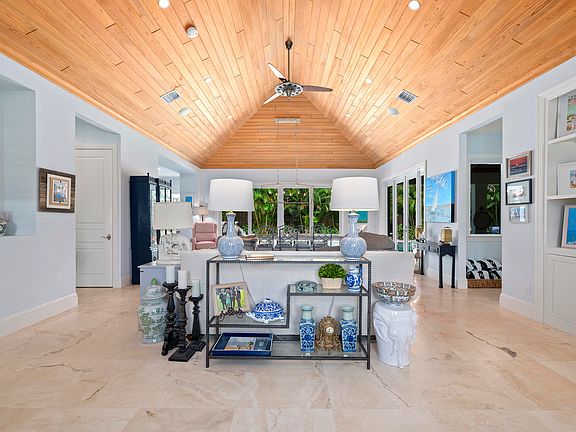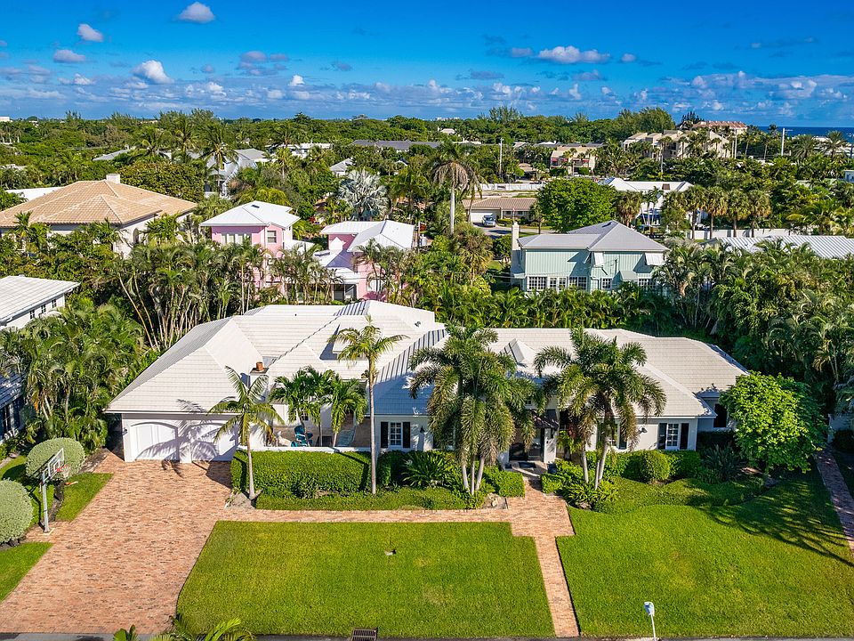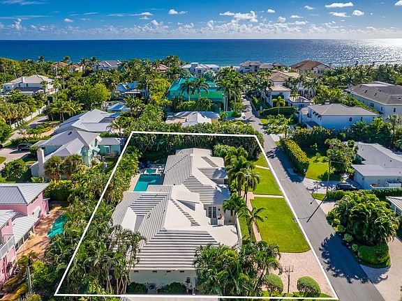 Stunning home on oversized lot. Private beach access! This gem was completely rebuilt in 2011, and updated this year including an all-new gourmet chef's kitchen and addition of guest suite with lush private patio. Surrounding the redesigned chef's kitchen, the living, dining and family areas boast an open layout with vaulted wood panel ceilings. A large master and 4 well situated guest suites provide ample space for family and friends. The home features truly unique outdoor space for entertaining or relaxing. The courtyard with wood burning fireplace is perfect for cozy winter nights. Over-looking the tropical grounds, heated pool and spa is an inviting loggia complete with summer kitchen, wet bar, and tv. Perfect for enjoying the South Florida lifestyle, this home is situated in a highly desirable area less than a mile from Atlantic Avenue and steps from the beach.