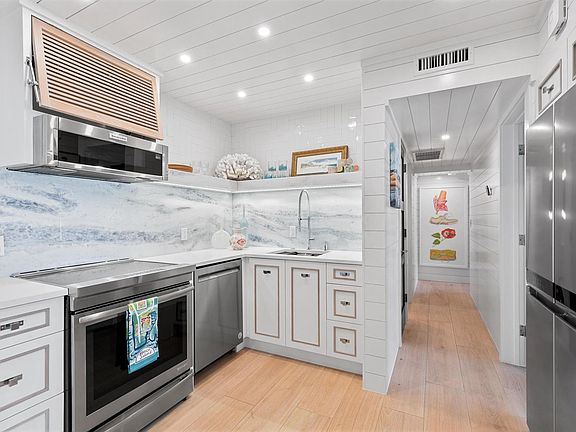 Embrace the island lifestyle in this beautifully renovated 2-bedroom, 1-bathroom first-floor condo, located in the sought-after Ville de Marco community on scenic Marco Island. Blending coastal charm with modern updates and storm-ready features, this residence offers both peace of mind and a true getaway feel. Inside, every detail has been thoughtfully designed — from shiplap-accented walls and ceilings to designer wallpaper, custom tilework, and plantation shutters. Durable tile floors throughout the living spaces and bathroom add style and easy maintenance, while oversized baseboards and high-end finishes create a refined look. Impact-resistant windows and sliders flood the condo with natural light, enhancing energy efficiency, quiet comfort, and storm protection. Step outside to your private covered patio, ideal for morning coffee or evening cocktails under Marco Island's glowing sunsets. With a boat dock lease available for under $500 per year, you'll have easy access to the waterways. Whether you're looking for a personal island escape, a full-time residence, or a savvy investment, this turnkey condo delivers it all. Surrounded by pristine beaches, boutique shopping, and coastal dining, you'll be living the lifestyle others only dream of.