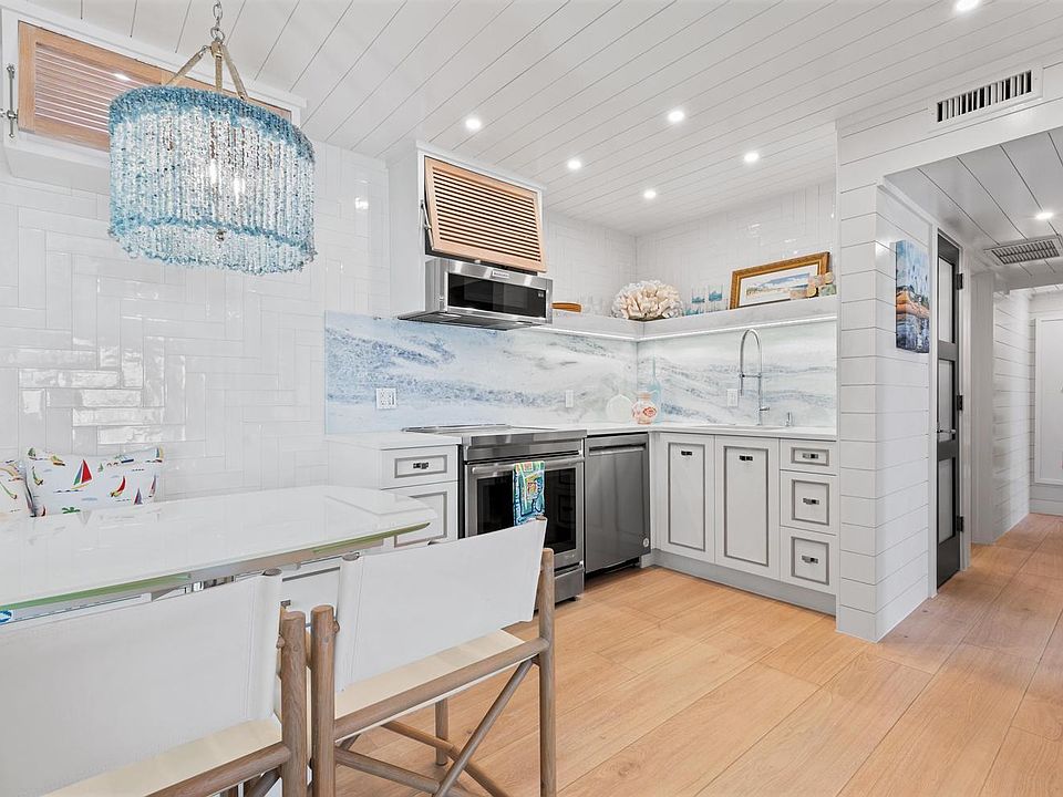 High-end finishesCustom tileworkDesigner wallpaperShiplap-accented walls and ceilingsPlantation shuttersImpact-resistant windows and slidersNatural light