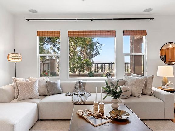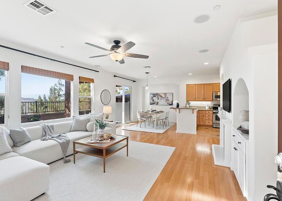 Highly popular end unit townhome overlooking the mountains & city lights in the WestRidge gated community of picturesque San Elijo Hills. This open-concept floor plan features 1,316 square feet of living space with 3 bedrooms, 2.5 bathrooms & a spacious backyard. Radiating with natural, light this newly carpeted & freshly painted property offers a large living room with gas fireplace, hardwood flooring, kitchen with stainless appliances, 2 car direct access garage & a generous primary bedroom with en-suite bathroom, walk in closet, soaking tub & private balcony for enjoying your morning coffee. The gated community of WestRidge offers access to the resort style pool, spa & serene water feature in the coveted development of San Elijo Hills that exudes small town charm. Steps away from top-rated San Elijo schools, parks, playgrounds, ball fields, dog park, shops, restaurants, grocery store & access to 18 miles of maintained trails, perfect for outdoor adventures.