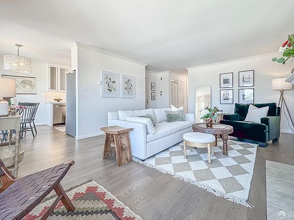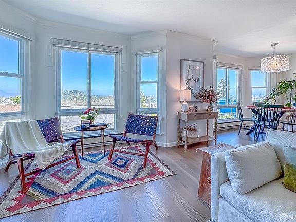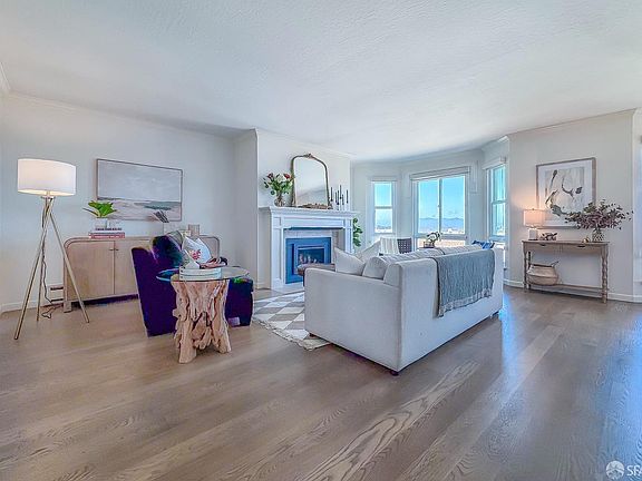 Windows on the World! Beautifully remodeled top floor condominium featuring mesmerizing views from the Financial District to the Pacific. A thoughtful renovation combines functionality with quality fixtures and finishes throughout. The gracious living room is ideal for entertaining and is anchored with a gas burning fireplace and custom tile surround. The stylish kitchen has been upgraded with stainless steel appliances and quartz countertops, and classic subway tile back splash. The reappointed bathroom benefits from a glass enclosed shower over tub and a skylight that emits fantastic natural light. Two oversized restful bedrooms with ample closet space are in the back of the property overlooking a lush green wall. Additional upgrades include white oak floors, crown molding, select new windows, custom window coverings, stylish light fixtures, and in-unit laundry. One car parking and bike storage complete this fantastic property. Excellent access to MUNI or north/south freeway commuters.