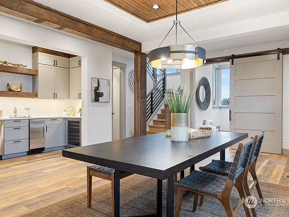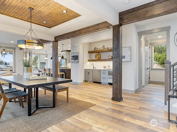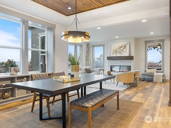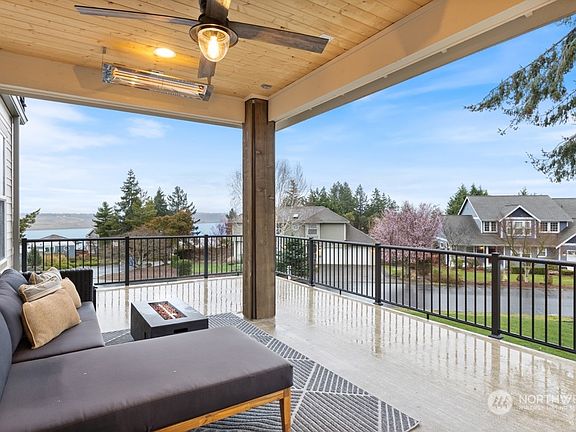Impeccable new home by Coba Construction w/views from Narrows passage to Chambers Bay. Over 3,200 sq ft & 3-car garage. Kitchen features double ovens, soft-close cabinetry, a porcine farm sink & large pantry. Tile surround fireplace in the great room & formal dining room w/ an accent ceiling. Light & bright office w/sliding barn door & the ULTIMATE wet bar w/bev. fridge, ice maker & 2nd dishwasher. Covered back deck w/black iron railing, patio heaters & easy access to a fully landscaped backyard. Primary suite boasts stunning views from private balcony. Attached 5-pc bath w/ heated floors. Two additional Br's, full BA, and laundry w/storage & sink are also on this level.The lower level features full bath, 2nd wet bar bonus & another bedroom